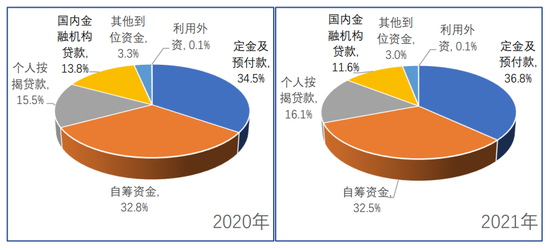 图1:2020年与2021年房地产开发资金来源中各项占比情况