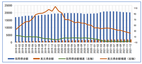 2021年房地产相关融资增速持续下滑。截至2021年末,个人住房贷款余额为38.3万亿元,同比增长11.3%,自2016年末以来增速持续下降26.8个百分点;在信贷余额中的占比降至19.9%,较2020年回落0.2个百分点。房地产开发贷余额为12.01万亿元,同比增长0.9%,自2018年三季度以来持续下降23.6个百分点;在信贷余额中占比为6.2%,较2020年回落约0.5个百分点。投向房地产领域的资金信托规模约为1.76万亿元,同比下降22.8%;占资金信托总规模的11.74%,较2020年下降2.23个百分点。房企信用债存量为1.92万亿元,同比下降5.2%。房地产股权融资规模较小,全年仅为3.9亿元。房地产中资美元债融资余额为1978亿美元(约合1.26万亿元人民币),同比增长26.8%,较2021年下降约14.8个百分点。2021年末,上述前四项融资余额合计约为54.2万亿元,占社融存量的17.25%,较2020年下降0.62个百分点。如果不是2021年四季度最后两个月融资状况在政策的推动下有所改善,则全年房企的融资状况可能会比上述数字更差。