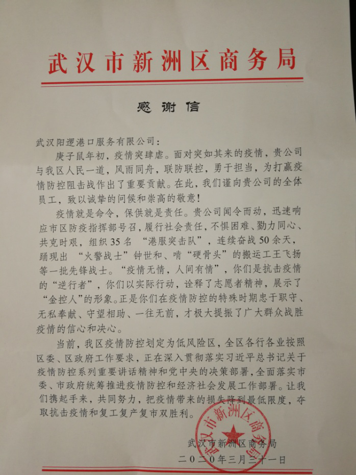 4月2日,武汉阳逻港口服务有限公司收到武汉市新洲区商务局送来的一封感谢信,对港服公司在全面打赢市区疫情防控阻击战中所承担的社会责任和重要贡献表示感谢,充分肯定了港服抗疫突击队日夜奋战在疫情防控一线所取得的工作实绩和队员们的奉献精神,并献上了最真挚的谢意。 新洲区商务局在感谢信中强调:“疫情无情,人间有情,你们是抗击疫情的‘逆行者’,你们以实际行动,诠释了志愿者精神,展示了‘金控人’的形象,正是你们在疫情防控时期忠于职守、无私奉献、守望相助、一往无前,才极大提振了广大群众战胜疫情的信心和决心。” 据了解,新型冠状病毒肺炎疫情阻击战打响以来,按照省委、市委的统一部署,武汉金控集团组织千名干部职工下沉到硚口、汉阳、江汉3个区11个街道91个社区,筑起社区疫情防控的铜墙铁壁。在集团公司的统一领导和统筹调度下,港服公司35名干部职工主动请缨加入集团硚口区疫情防控第四小组、第六小组,在社区连续奋战50余天,积极发挥志愿工作者“勇于担当”、“敢于奉献”的带头作用,冲锋在前,主动认领最危险最艰苦的工作内容,积极配合社区做好武汉硚口区长丰街道和宝丰街道下辖的10余个社区的疫情防控工作,以实际行动保卫着千家万户的生命安全健康。截止到3月29日,港服突击队员们累计完成体温监测15282人次,发放出入卡并登记人员信息及劝返人员4008组,电话咨询摸排2560人次,入户实地摸排2880户,消杀楼栋214栋,累计面积72100平米,消毒车辆206辆,疫情海报及条幅宣传89张,搬运蔬菜物资52余吨,发放菜品及快递2905份,协助居民完成健康码注册及扫描登记3367组,一组组数据,一件件实事,凝聚着港服突击队员的辛勤汗水和聪明智慧。他们以高度的政治责任感做好联防联控工作,为打赢这场疫情防控阻击战作出积极贡献。 在举全公司之力,毫无保留地全力下沉社区积极参加疫情防控工作的同时,港服公司还在抗疫关键时刻,积极发动一切资源筹集抗疫钱款和物资,支持抗疫最前线,帮助武汉同济医院筹集了重症监护室急需的20套正压防护头套以及30天用量的配件,公司党员干部主动带头捐款捐物,组织员工开展爱心捐赠接力,截止到目前,公司累计捐款达15万,这些善款和物资对医护一线抗疫工作者说,无疑是雪中送炭。 除此之外,为加强疫情防控工作力度,公司抽调精干力量及时成立工作专班,全面做好疫情期间宣传教育、督导检查、联防联控等工作,对督导情况定期形成检查通报,还建立每日员工动态信息汇报制度,发现问题及时处置上报,并给员工配发防疫中医药预防方,用于新型冠状病毒感染的肺炎疫情预防,切实将保护员工健康落到实处。公司旗下武汉新港华中贸易服务区项目坚持监测不漏一人、管控不漏一人的防控措施,做到消杀工作定时、定点、有记录,确保项目工地平稳安全,成为阳逻无疫情项目地,公司230多名员工目前无一例感染。 目前,武汉市疫情防控取得阶段性重大成果,各类企业也有序复工复产。在这场即将胜利的战“疫”中,港服人、金控人以“勇挑重担、不辱使命、主动担当、积极作为”的奉献精神,汇聚起共克时艰的磅礴力量,以实际行动彰显“红色金控”守初心、担使命,为人民群众铸就抵抗疫情的坚固城墙,为疫情防控凝聚起强大的正能量!