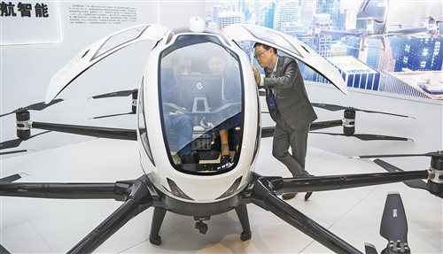 11月19日,在武汉举办的2020中国5G+工业互联网成果展上,参观者了解一台自动驾驶飞行器。新华社记者 程 敏摄